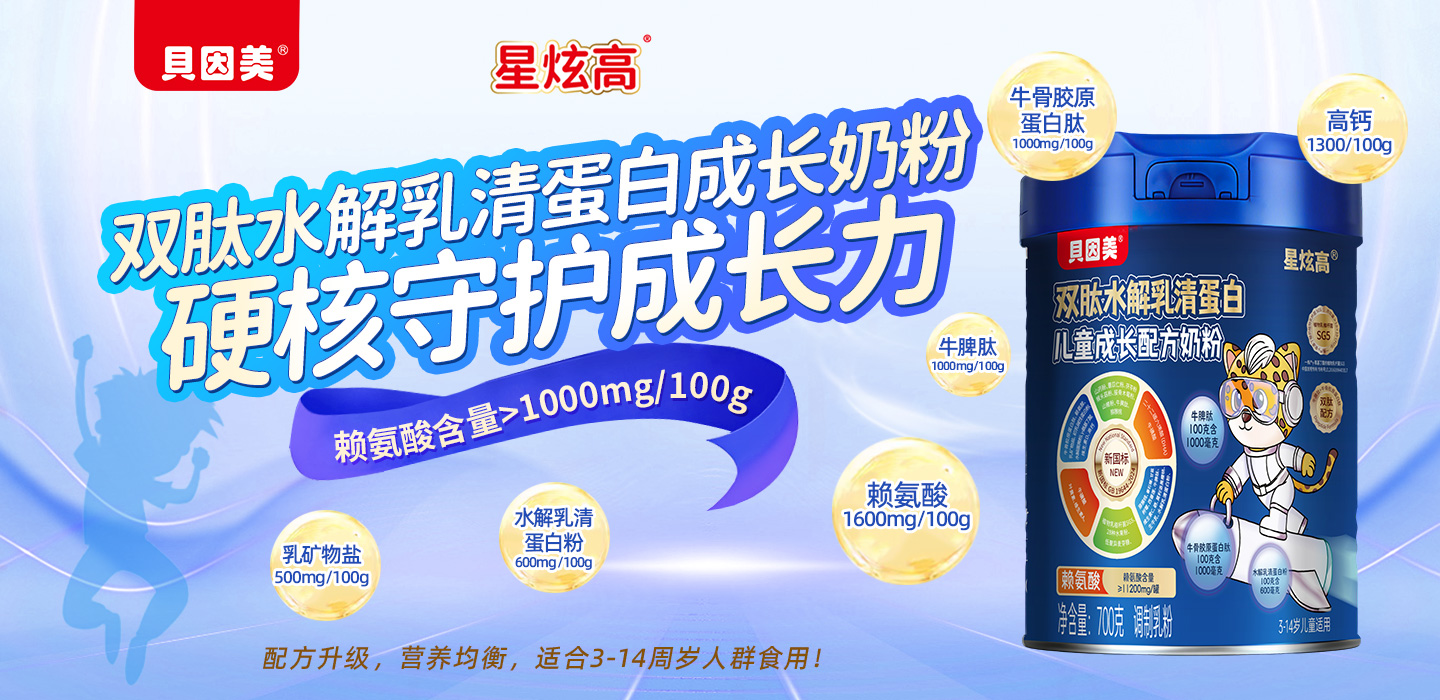 貝因美星炫高兒童成長配方奶粉,新國標認證,GB19644-2024,適合3-14周歲人群食用!嚴選優(yōu)質奶源,源頭把控!賴氨酸含量>1000mg/100g,高含量更營養(yǎng)!同時,每100g更添加乳礦物鹽500mg,高鈣1200mg,初乳堿性蛋白粉20mg,水解蛋黃粉10mg,葉黃素162mg,同時富含多種維生素和礦物質,均衡營養(yǎng)配比,好消化好吸收,守護成長健康!