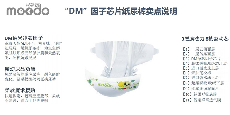 悅萌動(dòng)品牌,產(chǎn)品涵蓋紙尿褲、悅動(dòng)褲系列,輕薄防漏,羽柔舒適,DM因子芯體,獨(dú)具特色。DM因子(diatom)是一種具有分子篩結(jié)構(gòu)的材料,該種結(jié)構(gòu):具有極強(qiáng)的物理吸附和離子轉(zhuǎn)換性能!能有效的吸附尿尿所產(chǎn)生的異味、能夠預(yù)防紅屁股。