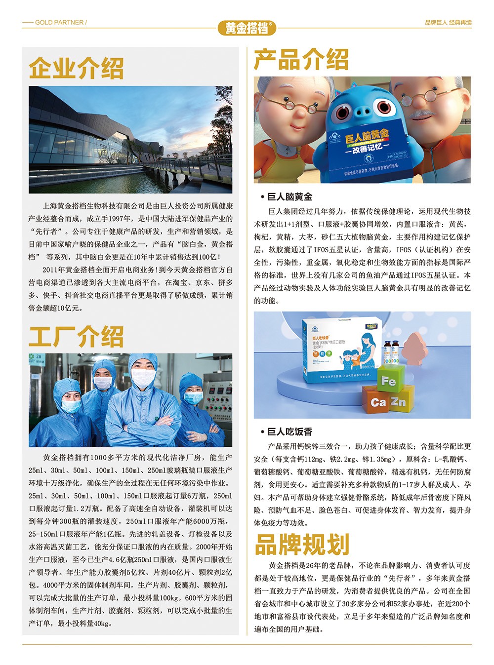 上海黃金搭檔生物科技有限公司是巨人集團(tuán)旗下,由史玉柱傾心打造的一家注冊(cè)資本為1億港元的外商獨(dú)資企業(yè)。公司主導(dǎo)品牌“腦白金”、“黃金搭檔"等旺銷(xiāo)多年,已成為家喻戶(hù)曉的知名健康品牌,公司更是憑借產(chǎn)品協(xié)同增效的顯著特點(diǎn)和優(yōu)質(zhì)售后服務(wù),成為老百姓表達(dá)愛(ài)心、孝心和保健自用的信賴(lài)品牌。山東修企藥業(yè)有限公司為上海黃金搭檔生物科技有限公司授權(quán)全國(guó)母嬰渠道線下實(shí)體運(yùn)營(yíng)商。
