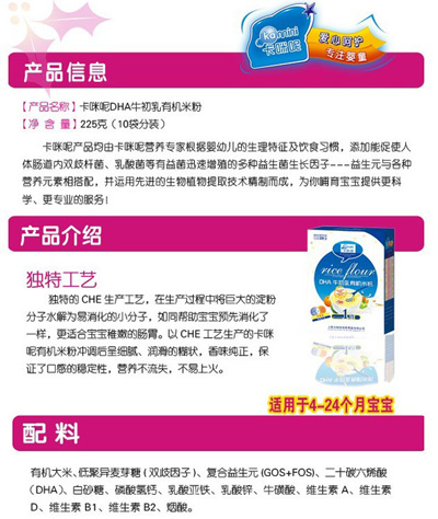卡咪呢有機(jī)米粉系列是專(zhuān)為中國(guó)寶寶設(shè)計(jì)的營(yíng)養(yǎng)輔食,選用有機(jī)大米,科學(xué)搭配維生素AD等維生素,還特別添加;撬、DHA、AA等有助智力發(fā)育的營(yíng)養(yǎng)成分,富含15種營(yíng)養(yǎng)素。現(xiàn)上?ㄟ淠啬笅胗闷酚邢薰久嫦蛉珖(guó)空白市場(chǎng)區(qū)域誠(chéng)招卡咪呢有機(jī)米粉代理商。