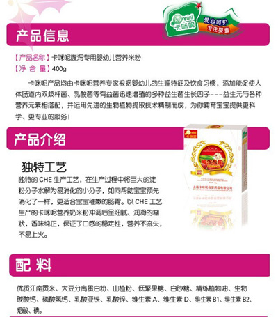 卡咪呢乳清蛋白嬰幼兒營養(yǎng)米粉是上?ㄟ淠啬笅胗闷酚邢薰酒煜庐a(chǎn)品,精選優(yōu)質(zhì)大米制作,特別添加乳清蛋白和益生元,提高寶寶抵抗力,促進(jìn)寶寶changdao的消化吸收,上市以來廣受父母消費(fèi)者的青睞。