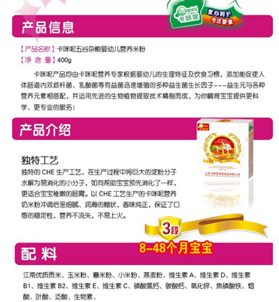 卡咪呢有機(jī)米粉系列是專為中國(guó)寶寶設(shè)計(jì)的營(yíng)養(yǎng)輔食,選用有機(jī)大米,科學(xué)搭配維生素AD等維生素,還特別添加;撬帷HA、AA等有助智力發(fā)育的營(yíng)養(yǎng)成分,富含15種營(yíng)養(yǎng)素,F(xiàn)上?ㄟ淠啬笅胗闷酚邢薰久嫦蛉珖(guó)空白市場(chǎng)區(qū)域誠(chéng)招卡咪呢有機(jī)米粉代理商。