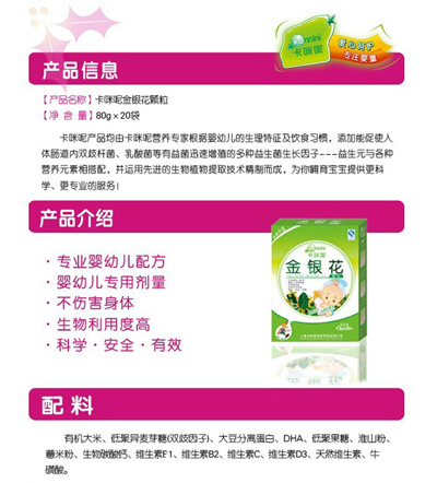 卡咪呢有機米粉系列是專為中國寶寶設(shè)計的營養(yǎng)輔食,選用有機大米,科學(xué)搭配維生素AD等維生素,還特別添加;撬、DHA、AA等有助智力發(fā)育的營養(yǎng)成分,富含15種營養(yǎng)素。現(xiàn)上?ㄟ淠啬笅胗闷酚邢薰久嫦蛉珖瞻资袌鰠^(qū)域誠招卡咪呢有機米粉代理商。