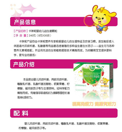 卡咪呢小兒板藍(lán)根顆粒是上?ㄟ淠啬笅胗闷酚邢薰酒煜庐a(chǎn)品,專為嬰幼兒設(shè)計(jì),專業(yè)、安全,幫助寶寶可以預(yù)防感冒抵抗病毒,是廣大父母育兒的好幫手?ㄟ淠匦喊逅{(lán)根顆粒不含任何色素、防腐劑,安全放心。