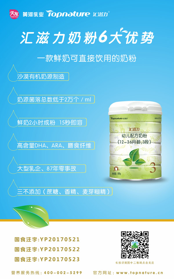 作為天友黃河乳業(yè)嬰幼兒配方奶粉的核心推廣品牌。匯滋力產(chǎn)品生產(chǎn)全部采用集團(tuán)旗下天寧有機(jī)牧場(chǎng)的優(yōu)質(zhì)鮮奶制造,天寧有機(jī)牧場(chǎng)為農(nóng)墾乳業(yè)聯(lián)盟中的標(biāo)桿牧場(chǎng)。