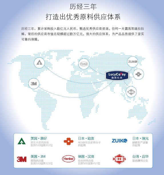 LUCYCAREY露茜凱瑞成長褲選用全球頂尖供應(yīng)商的紙尿褲原材料:住友、三大雅高分子吸水材料;美國3M魔術(shù)貼;德國萊卡松緊帶;美國進口原生木漿;德國漢高粘合劑;美國、日本進口無紡布;進口超柔軟透氣底膜等。另外,全世界zui先進的全自動紙尿褲生產(chǎn)線,年產(chǎn)銷數(shù)億片紙尿褲的成熟的生產(chǎn)制造團隊,確保產(chǎn)品高品質(zhì)。
