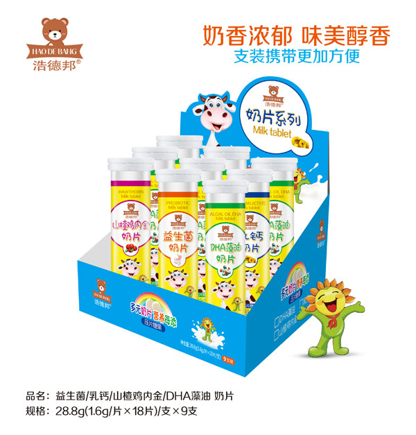 浩德邦奶片系列甄選優(yōu)質原料,采用先進工藝制作,不添加色素、香精、防腐劑等,有DHA藻油、乳鈣、山楂雞內金、益生菌四大配方,有瓶裝和支裝兩種不同的規(guī)格,滿足不同需求,口口香脆好滋味。