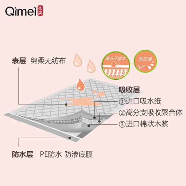 柒美產(chǎn)后護(hù)理墊巾為醫(yī)用消毒產(chǎn)品,表層柔軟透氣,防止回滲,保護(hù)肌膚干爽自然。中層采用混合式的高分子吸水絨毛漿吸收結(jié)構(gòu),凝聚快速充分。透氣PE膜設(shè)計(jì),排氣孔不間斷工作,摒棄悶熱,告別潮濕,舒爽每一天。