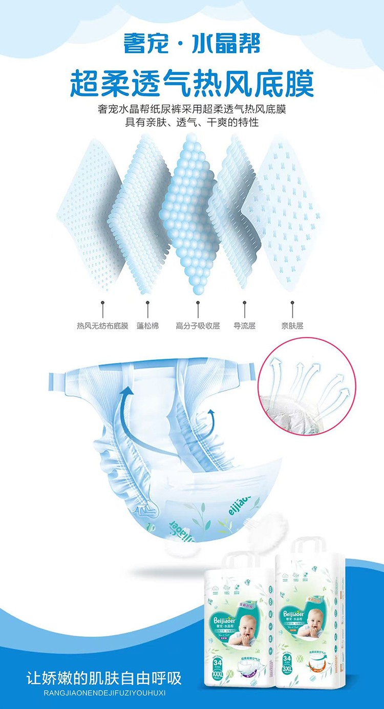 貝嬌兒奢寵水晶幫紙尿褲,采用超柔透氣熱風(fēng)底膜,具有親膚、透氣、干爽的特點(diǎn)。親膚棉柔面層,呵護(hù)嬌嫩肌膚;0.1cm纖薄,輕薄無負(fù)擔(dān);進(jìn)口高分子,小身材大吸量;約50000個呼吸微孔,空氣循環(huán)暢通,透氣干爽,遠(yuǎn)離紅屁屁。凸點(diǎn)設(shè)計(jì),減少接觸面,及時散發(fā)悶熱潮氣。超柔超薄空氣芯,全方位瞬吸導(dǎo)流,拒絕鼓包,拒絕斷層,多次尿量,一片瞬吸,鎖住尿液不回滲,屁屁拒絕潮濕,整晚安睡。