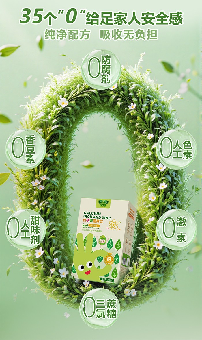 更值得一提的是,產(chǎn)品中特別添加了納豆成分,能自然帶來天然 K2(非化學(xué)合成 K2);同時融入 400IU 維生素 D3,為鈣的日常作用發(fā)揮提供助力。在成分安全性上,百合康綠冠軍鈣鐵鋅營養(yǎng)飲更是嚴格把控,實現(xiàn) 35 項 0 添加,不包含香精、甜味劑、色素與防腐劑,且在包裝上直接標識 0 添加,讓家長能清晰看到產(chǎn)品的純凈用心。此外,產(chǎn)品不含 18 項常見過敏原,敏感體質(zhì)的孩子也能安心享用。