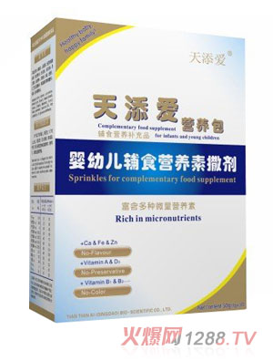 天添愛輔食營養(yǎng)素是根據(jù)嬰幼兒的身體特征而研發(fā)的保健產(chǎn)品,產(chǎn)品中含有很豐富的維生素,能改善嬰幼兒身體素質(zhì),給寶寶有一雙明亮的眼睛,讓您的寶寶更加可愛。