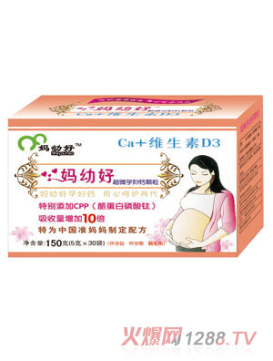 媽幼好超微孕婦鈣顆粒依據中國營養(yǎng)學會制定的《中國居民膳食營養(yǎng)素參考攝入量》和《中國居民膳食指南》,根據中國孕婦、哺乳期的婦女每日對鈣及維生素的需求特研制而成,性能溫和、安全、吸收好、利用率高,廣受媽媽們的好評,現(xiàn)面向全國空白市場區(qū)域誠招經銷商加盟。