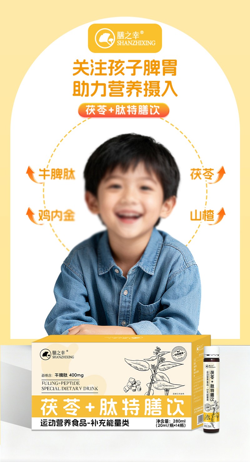 【配料表】水、木糖醇、茯苓(10%)、雞內金(7%)、山楂(7%)、牛脾肽(400mg/瓶)、麥芽、山藥、益智仁、橘皮、白扁豆、桑葉、生姜、薏苡仁、蓮子、芡實、佛手、甜菊糖苷、檸檬酸、檸檬酸鈉、山梨酸鉀