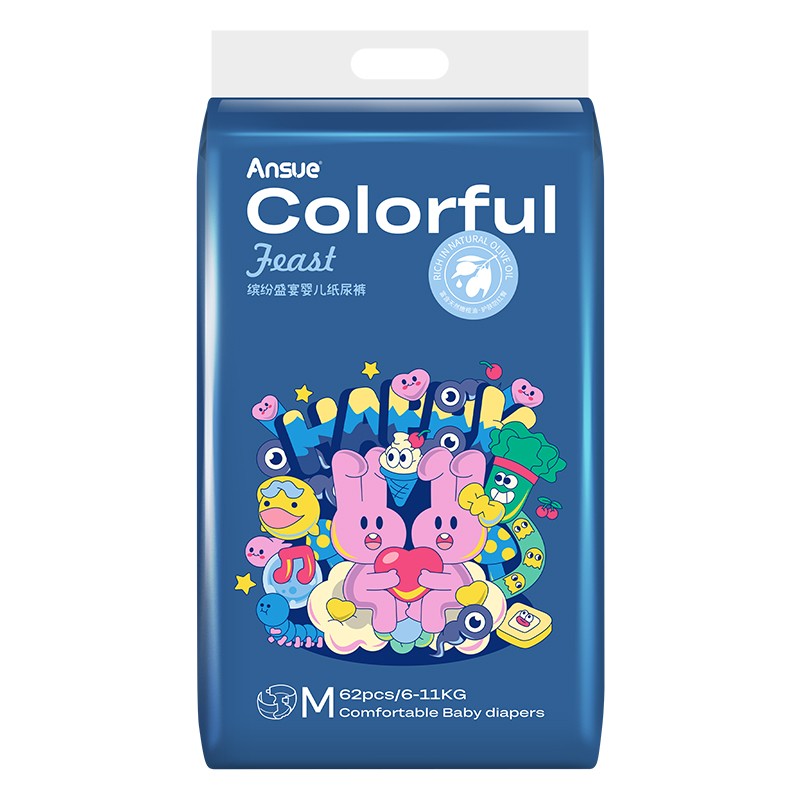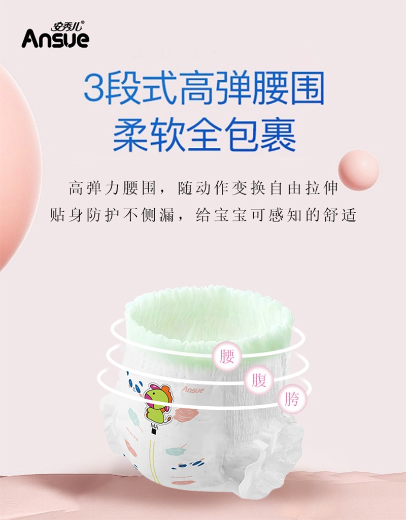 繽紛盛宴嬰兒紙尿褲/拉拉褲,云般柔軟,專為嬰兒肌,多彩設(shè)計(jì)+6代芯體,守護(hù)寶寶每一步。1片瞬吸,8次尿量。瞬吸高分子,一夜一片睡香香;3D表層+智選優(yōu)材,筑牢“屁屁防護(hù)盾”;3D雙層柔點(diǎn)觸感,拒絕潮濕,時(shí)刻干爽親膚;多重品質(zhì)檢驗(yàn),嚴(yán)選優(yōu)材,安全體驗(yàn)有保障;3段式高彈腰圍,柔軟全包裹,隨動(dòng)作變換自由拉伸,貼身防護(hù)不側(cè)漏,給寶寶可感知的舒適;萃取橄欖油精華,呵護(hù)嬌嫩肌,有效防紅臀。搭配科學(xué)護(hù)理提示,換褲清潔、過敏應(yīng)對(duì)全涵蓋。選安秀兒,給寶寶“臀”級(jí)寵愛~