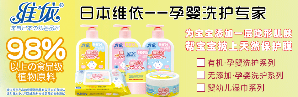 現(xiàn)在,供應(yīng)中國(guó)市場(chǎng)的維依品牌旗下產(chǎn)品包括了已經(jīng)得到國(guó)際市場(chǎng)高度認(rèn)可的高端定位的有機(jī)·孕嬰洗護(hù)系列(萃取歐洲有機(jī)農(nóng)場(chǎng)的天然有機(jī)植物精華,針對(duì)東方孕產(chǎn)婦特殊的生理體征和嬰幼兒的嬌嫩膚質(zhì),運(yùn)用科學(xué)的、高科技的高精度技術(shù)提煉,100%純天然有機(jī)植物原料配合而成,無(wú)刺激、無(wú)過(guò)敏、無(wú)毒性、無(wú)副作用,含無(wú)淚配方,pH值5.5)和中檔定位的無(wú)添加·嬰幼兒洗護(hù)系列(無(wú)著色、無(wú)香料、無(wú)酒精、無(wú)防腐劑等,pH值5.5,含無(wú)淚配方,無(wú)過(guò)敏、零刺激、98%以上的天然原料配合)及無(wú)添加·嬰幼兒濕巾系列(pH值5.5,含保密配方,無(wú)著色、無(wú)香料、無(wú)酒精、無(wú)防腐劑和熒光增白劑等,)等,是綠色、天然、溫和、安全的高級(jí)孕嬰用品。