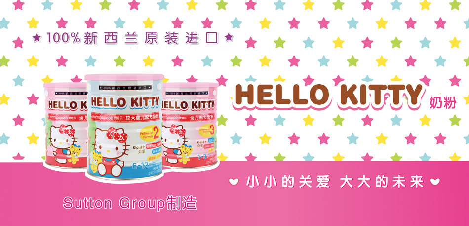 HELLO KITTY嬰幼兒配方奶粉由日本三麗鷗公司(HELLO KITTY是旗下品牌之一)授權(quán),新西蘭SUTTON GROUP公司生產(chǎn),原罐原裝出口至中國。天然優(yōu)質(zhì)的奶源、風靡全球的品牌和科學嚴謹?shù)墓に,成就HELLO KITTY嬰幼兒配方奶粉的一流品質(zhì)和銷售佳績,為了讓更多的寶寶享受到HELLO KITTY細心呵護,現(xiàn)公司面向全國火爆招商。