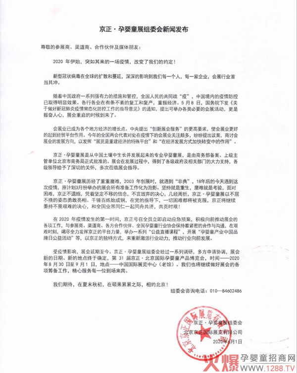 關(guān)于延期舉辦第31屆京正北京國(guó)際孕嬰童博覽會(huì)京正國(guó)際學(xué)前教育及裝備博覽會(huì)的通知。